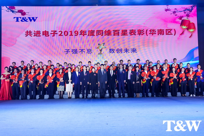 Commending the advanced, thanksgiving for the veterans and celebrating the New Year together by singing and dancing. From mid to late January, Gongjin Electronics companies around the country successively held 2019 annual commendation ceremony and 2020 early spring dinner, and all the staff in each region, the senior executives and guests company specially invited attended the party. The company's leaders, general managers Tang and Wang, presented 2019 Annual T&W Hundred-Stars Awards and the Service Award for the seasoned employees. Meanwhile, based on the theme of “Unremittingly Pursue Self-Renewal, Creating the Future Together", the employees from all over the companies have offered a wonderful Spring Festival art show.