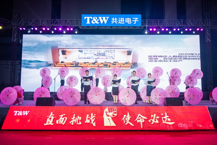 On the evening of June 3, Gongjin Electronics (South China Area) held the 2019 Employee Commendation Meeting and 2020 Team Singing Competition of “Facing the Challenge, Achieving the Mission” at the factory. The company’s Chairman Wang Dawei, the deputy general managers Long Xiaojing, Gong Pusheng, Wei Yiming, as well as all the leaders and employees working in Pingshan attended the meeting.