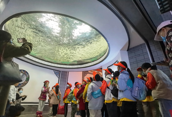 On that day, the children from Xizhou and Eryuan T&W Hope Primary Schools of Yunnan Province excitedly came to the first stop of the autumn outing - Dali Sea World for a close interaction with marine animals. Following the steps of the interpreter sister, the camp members saw various aquatic animals and plants that could be seen only in books at ordinary times. A wide variety of big and small fishes grabbed the attention of the camp members. Through the guidance and interpretation of the interpreter sister, the camp members knew the diversity of colorful lives. At the same time, the aquarium vividly presented the formation of Cang Mountain and Erhai Lake and folk tradition and customs such as tie-dyeing of Dali and the famous cuisine dance of Nanjian so that the students had a further understanding of their hometown.