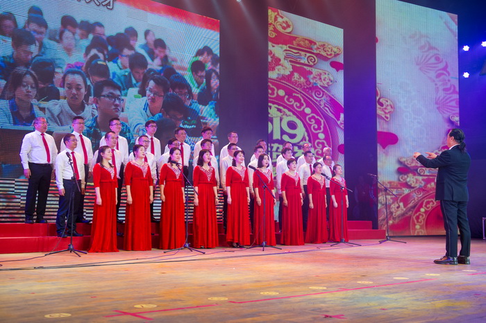 《不止苟且,不辱使命》2018大事记视频拉开晚会帷幕,综述了一年来经历的拼搏与荣耀。公司总经理唐佛南致新年贺辞,为全体员工送上祝福。当晚共表彰了58名同维百星、84名搬迁百英和23个搬迁先进团队、33名老员工服务奖。晚会精彩纷呈,11个节目经历了91场次的辛苦排练,最终精彩呈现。本次晚会共有演员166名,其中经理级以上的演员就有40名。公司董事长汪大维发表祝酒词,表达催人奋发的新春祝愿。