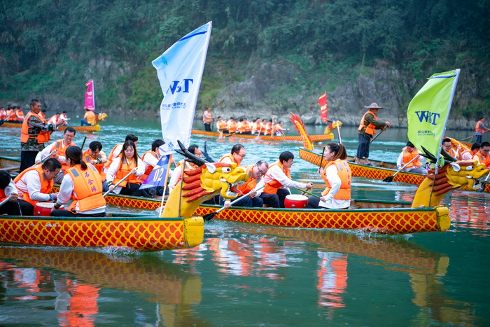充分热身后,龙舟竞渡现场,同维彩旗猎猎,水上奋力争先,岸上号声阵阵,参赛员工抡鼓摇桨齐心协力、竞相争渡,力争为团队拔得头筹。