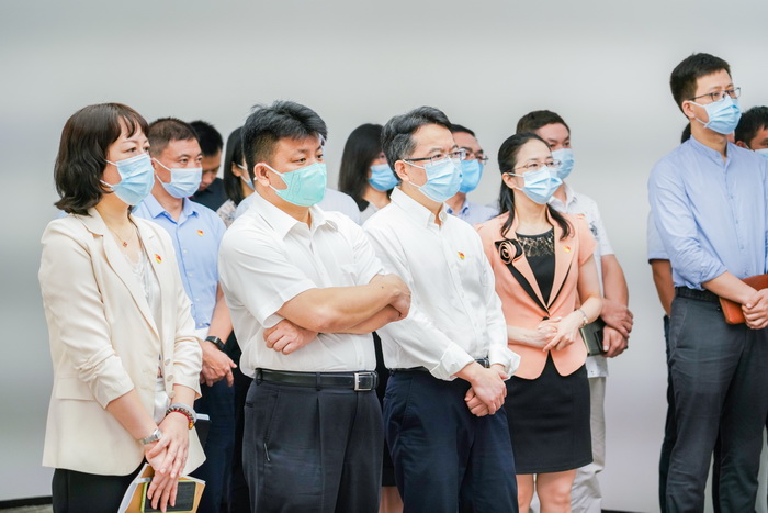 坪山区委领导一行在四栋七楼企业文化展厅观看了公司宣传片。随后调研并参观了公司党建阵地。通过现场解说和文字图片、一体机显示屏、专题展板等形式全方位、多维度展现公司和党委发展历程,组织建设和党建特色亮点。区委李映中副书记、徐国东部长对公司党建工作高度重视,不时询问党建“三同步”(党建摸排,组织建设,引领服务)落实情况。李副书记对公司企业高管与党委班子交叉任职模式、公司履行社会责任投入公益的善举、企业培养人才关怀员工的具体做法给予高度评价。