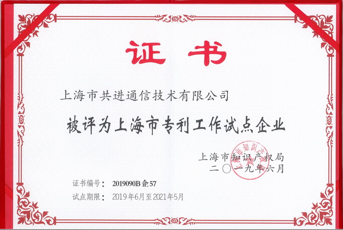 上海市beat365首页通信荣获“上海市专利工作试点企业”称号